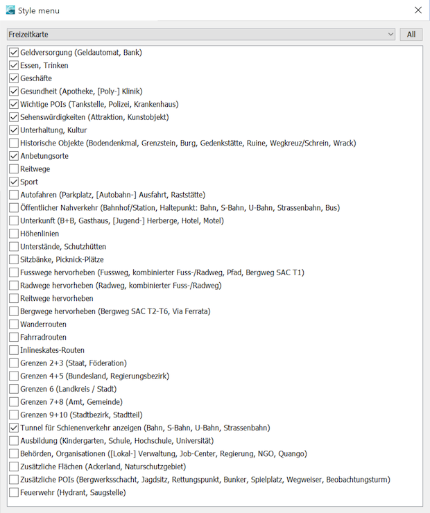 Das Theme enthält den Stil "Freizeitkarte". Mit den Optionen kann die Karte an die eigenen Bedürfnisse angepasst werden.