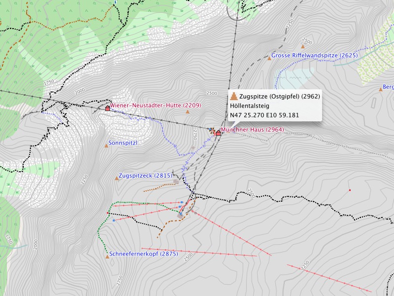 Kartendarstellung in BaseCamp: Die Zugspitze - der höchste Landpunkt Deutschlands (2962 Meter).
